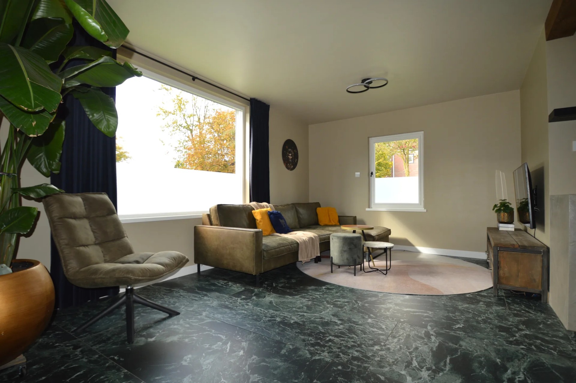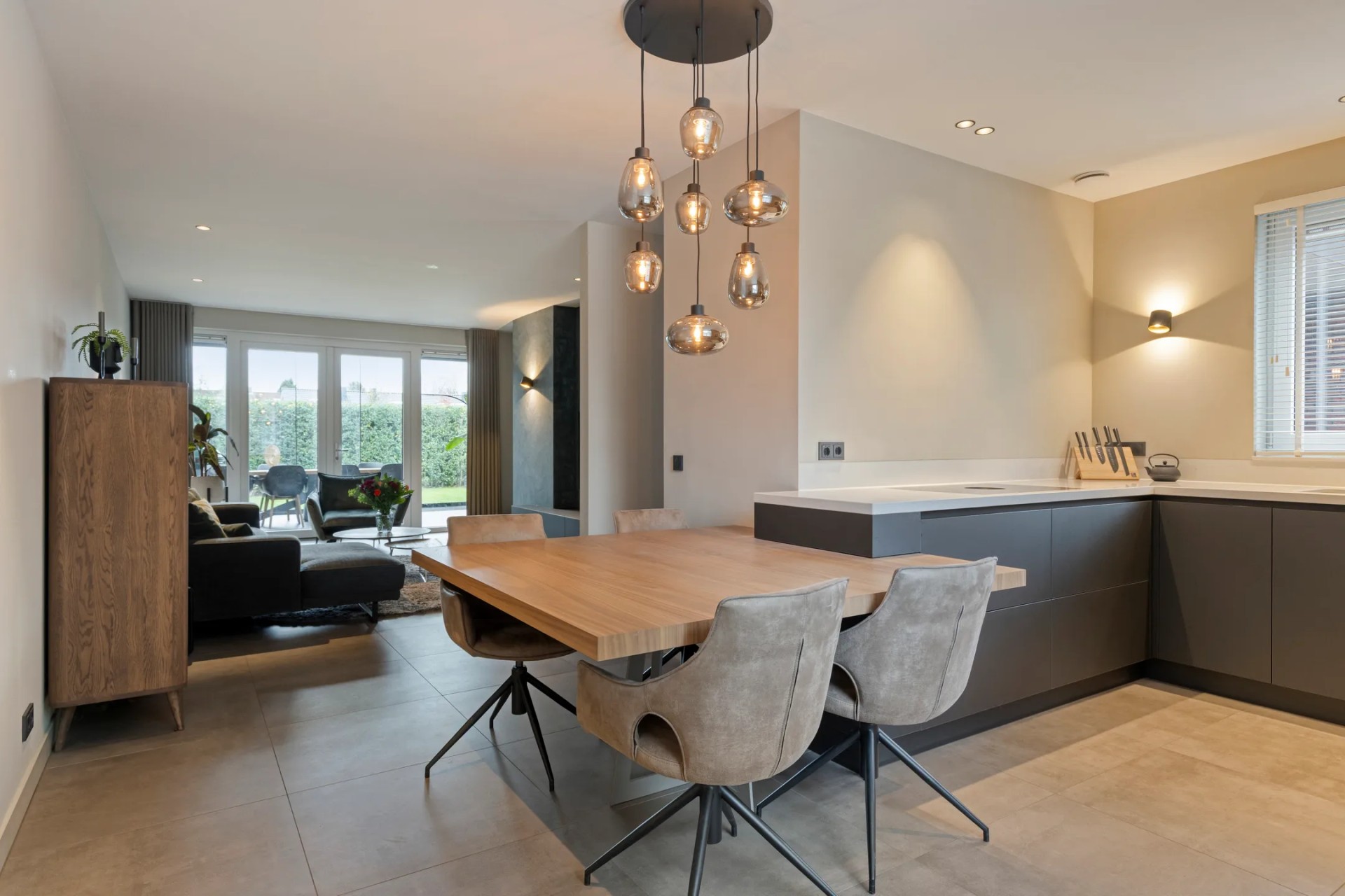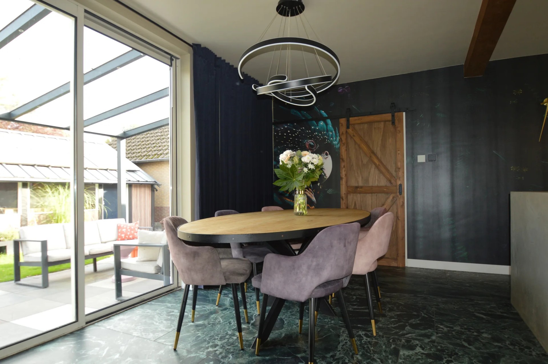 Leefkeuken, marmeren vloer kessel-eik